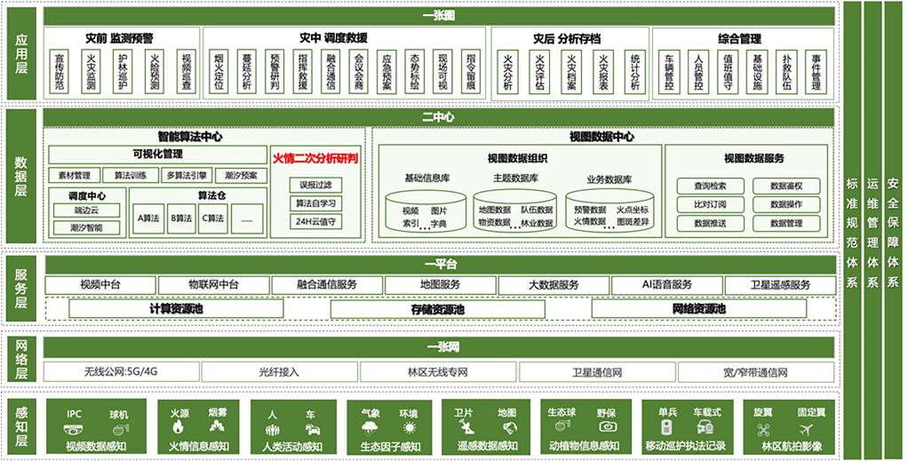 以视频监测(地)、无人机监测(空)、卫星遥感(天)等监测预警系统为基础,依托互联网、卫星通信、LTE、微波等通信传输方式,以防火大数据中心为支撑,建设三大平台(监测预警平台、指挥调度平台、抢险救援平台),最终建成一体化应急指挥调度中心,实现森林草原防火业务全流程信息化和智能化建设。